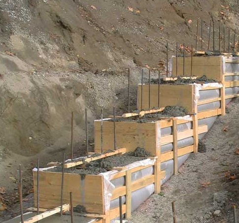 Tall concrete retaining walls to protect slope.